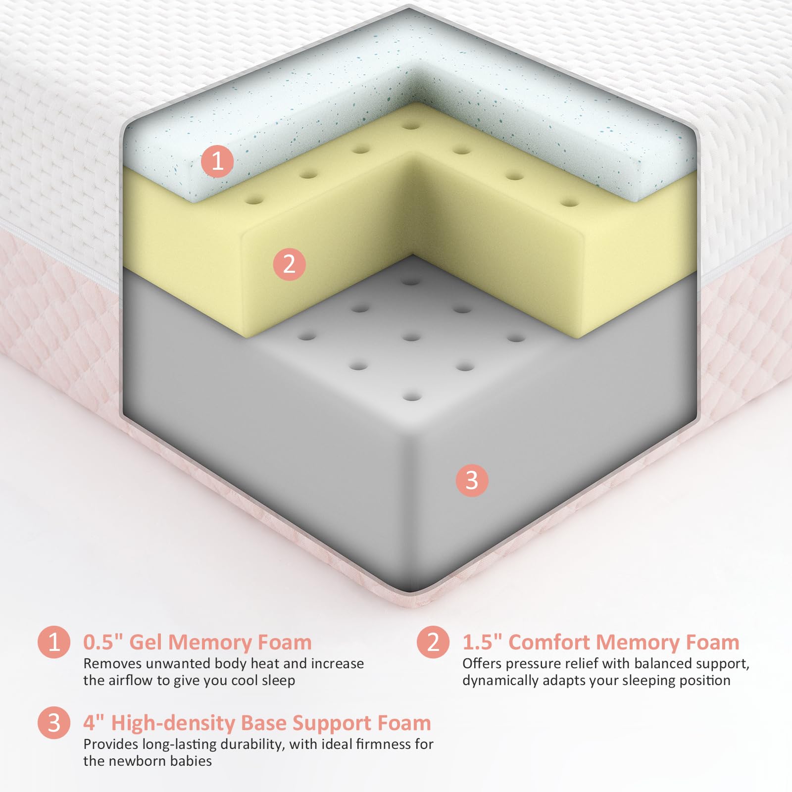 - 【Breathable & Comfortable Mattress】 Integrated with Gel-infused memory foam, open-cell memory foam and high-density support core, the triple-layered mattress helps to regulate temperature by accelerating air circulation and transferring unwanted heat away from the body, giving your baby a cool and comfortable sleep environment, thus ensures a through-the-night sleep